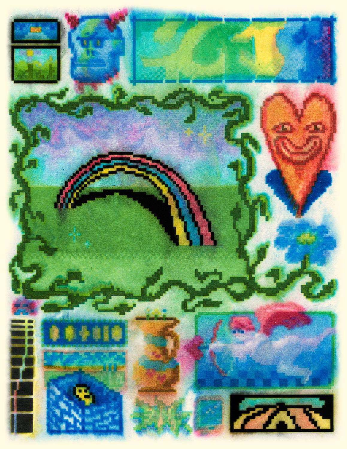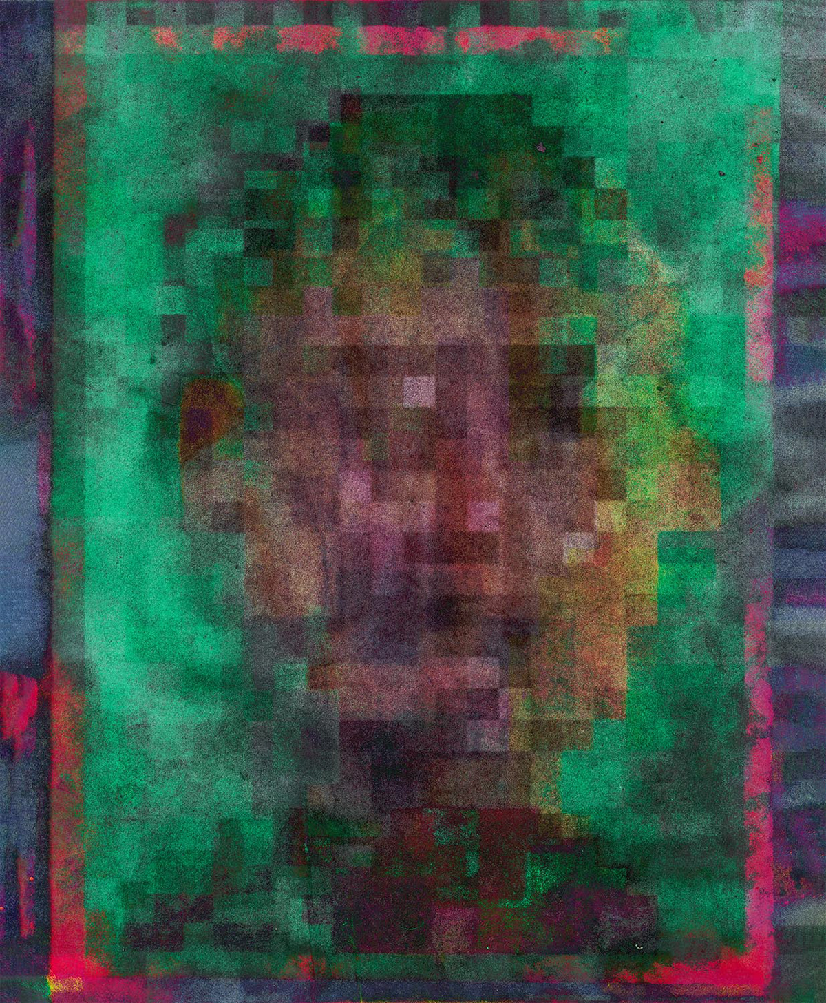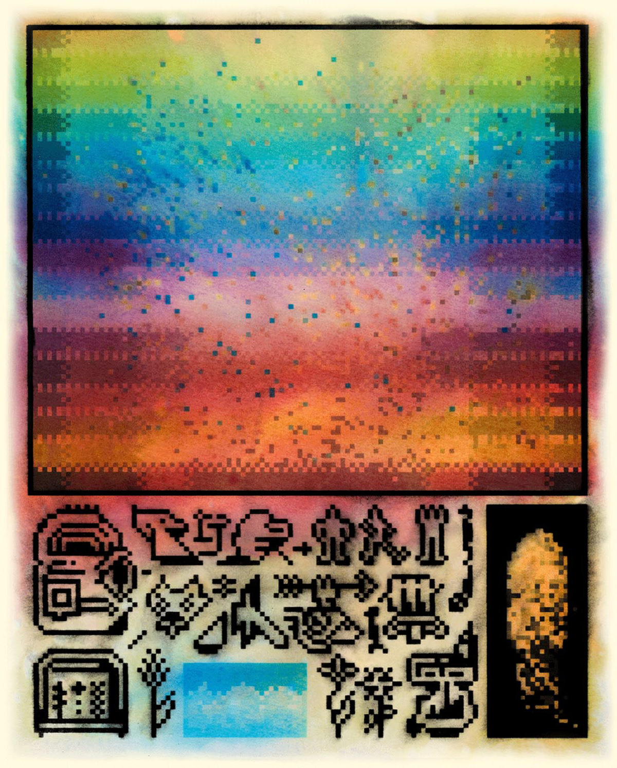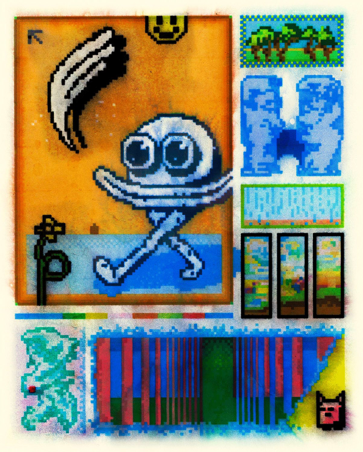 In this series, I focused primarily on the search for painterly pixel values and the transformation of the impressions characteristic of the screen into a material object in the form of a print on paper. The themes are based on the language of digital culture. Old computer games, pixel art, and the LoFi theme (low accuracy) inspired me to create the composition. The process of creating the works is a combination of digital processing and manual dissolving of the print with water. Experimenting with this technique is another reason for creating this series. Thanks to the physical interference with the paper, the image from the world of screens becomes less ideal and more human. By printing the composition on paper, it can be experienced on a physically perceptible surface.